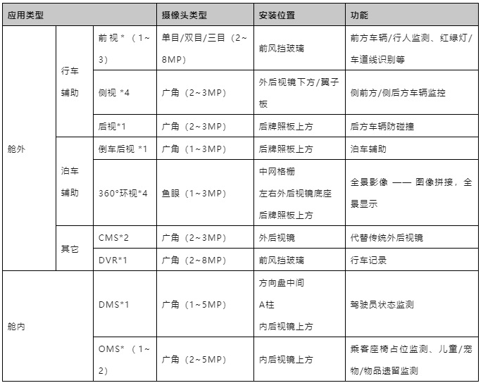 車(chē)載攝像頭的應(yīng)用場(chǎng)景可分兩大類(lèi):艙外應(yīng)用和艙內(nèi)應(yīng)用。艙外應(yīng)用包括泊車(chē)輔助、行車(chē)輔助、CMS、DVR等應(yīng)用;艙內(nèi)應(yīng)用包括DMS、OMS等應(yīng)用。