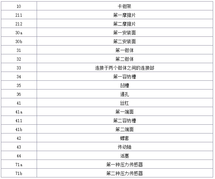 - 制動卡鉗:呈U形結構,分為第一鉗體和第二鉗體,分別位于剎車盤的兩側,并安裝兩個摩擦片,卡鉗通過連接部固定。