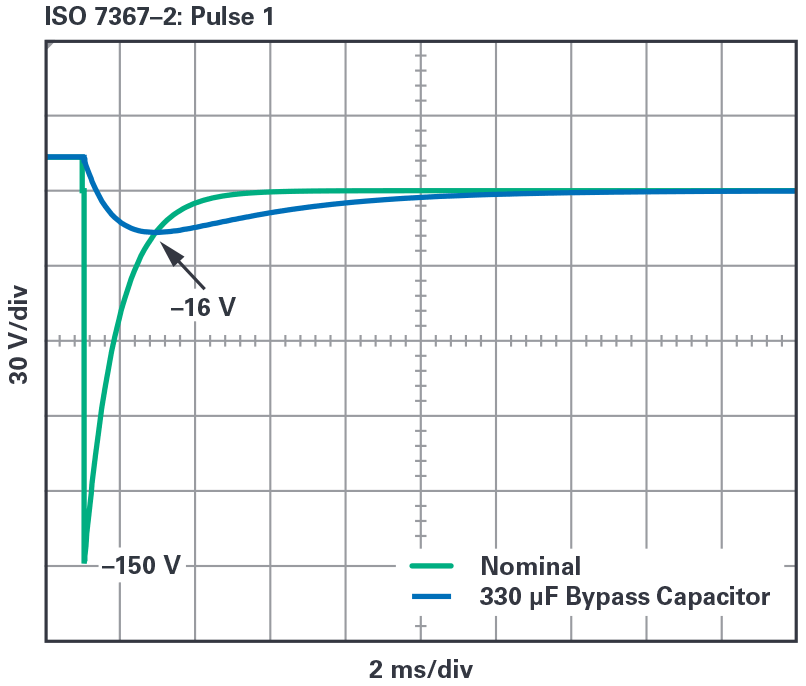 在最近的迭代中,ISO 7367-2電磁兼容規范主要介紹來自相對較高的阻抗源(2 Ω至50 Ω)的大幅度(>100 V)、短時持續(150 ns至2 ms)瞬變。這些電壓峰值通??梢允褂脽o源組件消除。圖1顯示定義的ISO 7367-2脈沖1,以及增加的330 μF旁路電容。電容將尖峰幅度從–150 V降低至–16 V,完全在反向電池保護電路支持的范圍內。ISO 7367-2脈沖2a、3a和3b的能耗遠低于脈沖1,所需的抑制電容也更少。