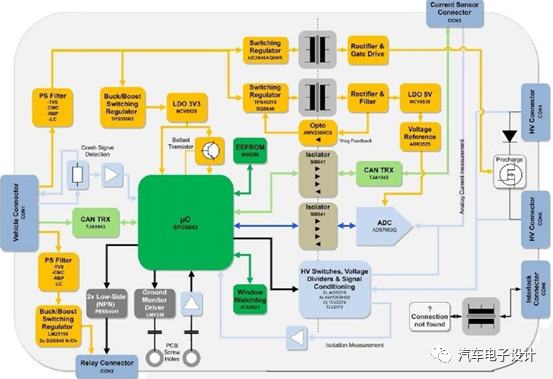 5)電源管理電路和EMC抑制:電池管理系統從電池模組和12V電池上驅電,通過合理的保護電路來管控不同節點的電源情況。