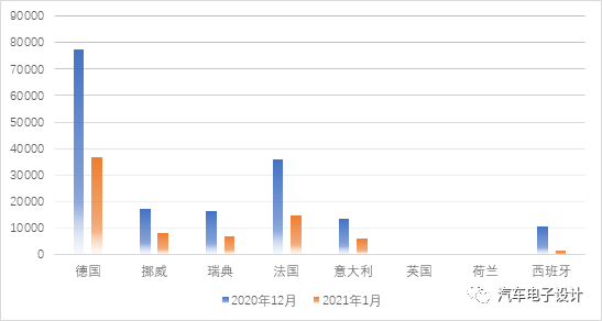 圖1 2021年1月份歐洲主要國家的新能源汽車銷量
