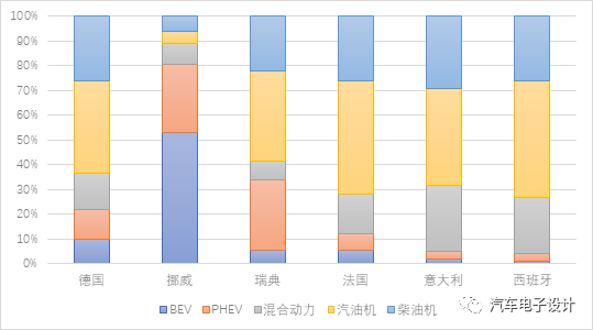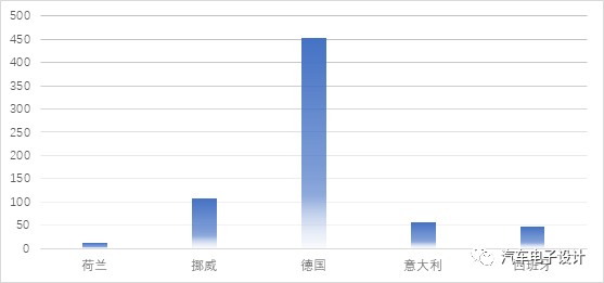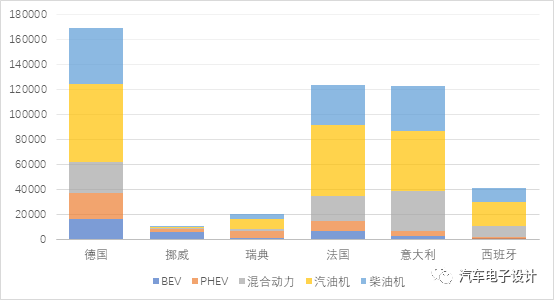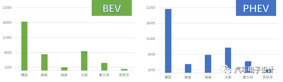 從新能源汽車的角度來看,德國、挪威、瑞典、法國和意大利的新能源汽車的銷售數量分別為36,903、8,309、6,893、14,654、6,254,西班牙稍少一些為1595臺。這個數據在去年年末沖量的基礎上開始回落,但是也是一個比較高的水平。