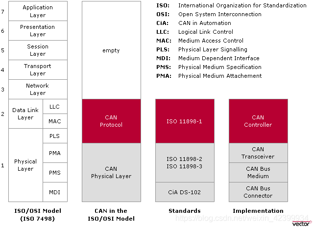 CAN底層標準都相同,涵蓋OSI模型中的物理層和數據鏈路層,與ISO/OSI模型的對應關系如下圖所示:
