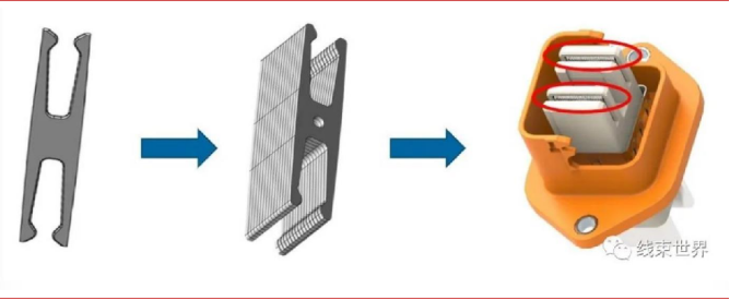 從設計上看,HC Stak 35 的端子通過銅板(35mm 厚)與 35 片刀叉型端子連接,由于插座端的端子是由 35 片 DEFCON 端子疊加形成,所以其能類似積木一樣,根據不同端口的需求不同,通過改變疊片數量來構成不同型號的連接器,這一模塊化設計方式能夠進一步降低端子加工成本。HC Stak 35 搭配 95 mm2的高壓線束,能夠支持 Model 3 充電 15分鐘增加 279 公里的快速充電與長效續航。但插片式連接器同樣有其缺點,其不耐拔插, 插片容易變形導致正負極插片無法保持在同一水平面上。