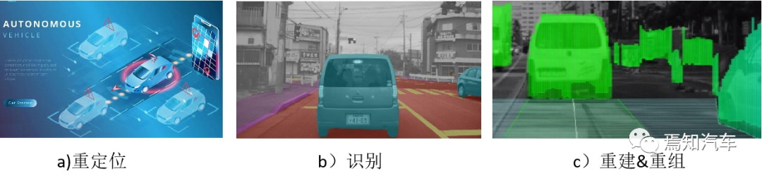 “場(chǎng)景重建”意味著從視頻序列推斷場(chǎng)景中的幾何體,包括車輛在場(chǎng)景中的位置。“要素識(shí)別”是一個(gè)術(shù)語(yǔ),用于將語(yǔ)義標(biāo)簽附加到視頻圖像或場(chǎng)景的各個(gè)識(shí)別對(duì)象中,識(shí)別中包括各種不同的層次結(jié)構(gòu)。“自車重新定位”是指車輛相對(duì)于其周圍環(huán)境的位置識(shí)別和度量定位。“關(guān)鍵目標(biāo)重組”是將重定位、識(shí)別、重建形成的三個(gè)組成部分信息重新整合成統(tǒng)一表示的方法。
