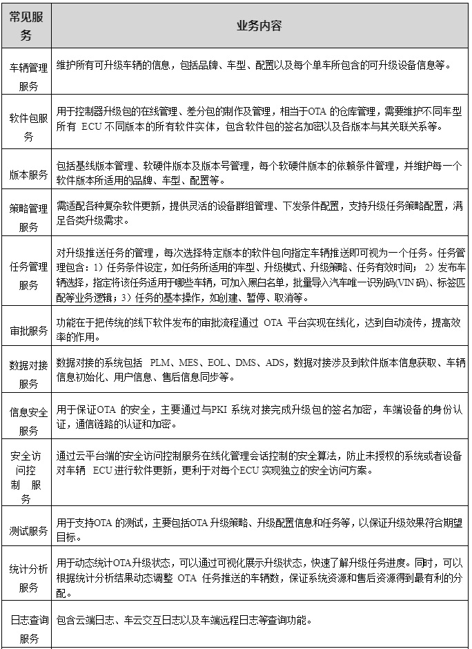 (4)業務服務層:業務服務層是 OTA 服務所有業務及相關流程管理功能在云平臺端的實現, 除了車輛管理服務、軟件包服務、版本服務、策略管理和任務管理 5 個支撐 OTA 的核心功能外,還包括關聯系統審批、數據對接、信息安全服務、測試、統計分析、日志查詢等重要輔助功能。由于不同的企業內部管理存在差異,云平臺所支持的輔助業務可能存在較大差異,常見服務列舉見表 2-4。