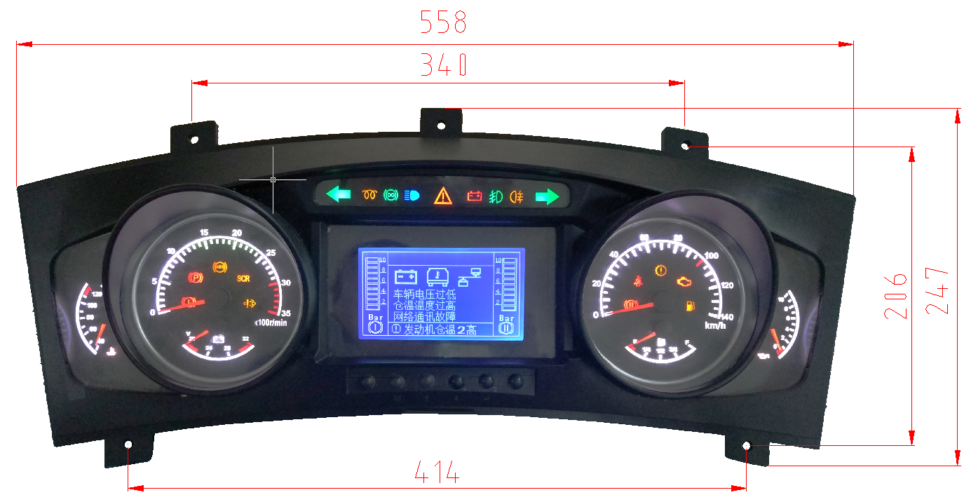 - 6個步進電機驅動的指針表盤 - 19個LED符號片 - 多個TFT符號片 - 5寸TFT單色屏 - 一個多音頻蜂鳴器 |