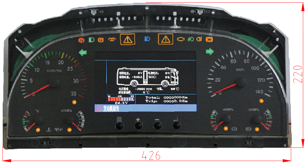 - 6個步進電機驅動的指針表盤 - 19個LED符號片 - 多個TFT符號片 - 7寸TFT彩色液晶屏 - 一個多音頻蜂鳴器 |