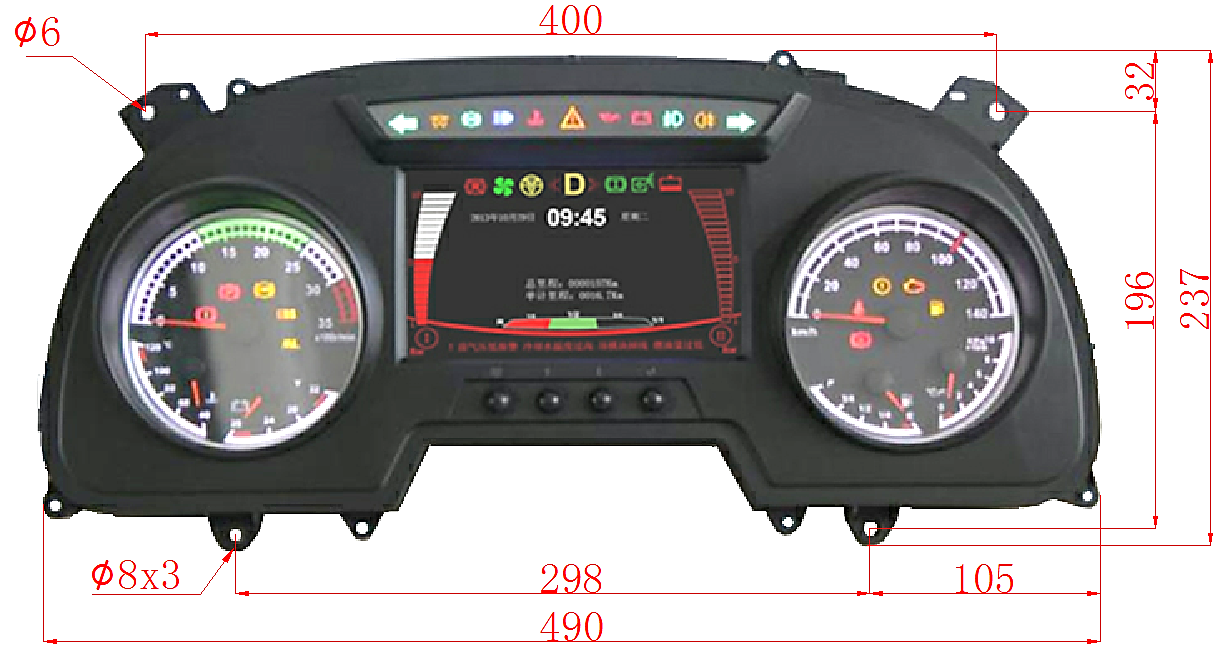 - 6個步進(jìn)電機驅(qū)動的指針表盤 - 24個LED符號片 - 多個TFT符號片 - 7寸TFT彩色液晶屏 - 一個多音頻蜂鳴器 |